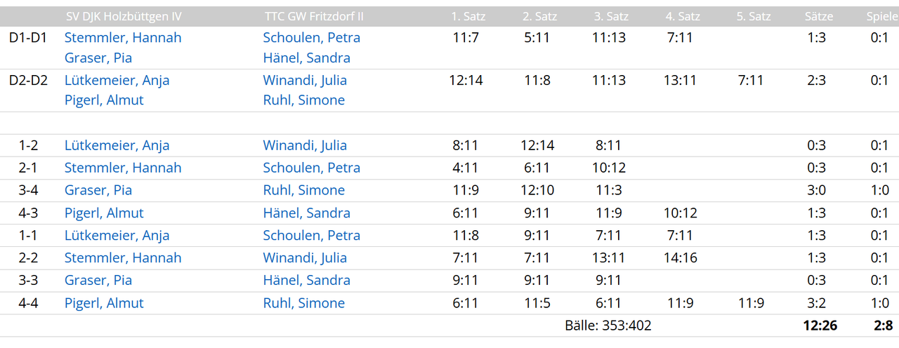 1. Herren verliert gegen TTG Niederkassel II mit 3:9 Dabei fing das Spiel eigentlich gut an mit zwei gewonnenen Doppeln von Thomas u. Polina sowie Julia u. Petra, doch dann konnte nur noch Thomas einen Punkt beisteuern und von da an ging es mit sieben klaren Niederlagen in Folge bergab. Im Vergleich zur Top-Leistung am vergangenen Freitag natürlich eine Enttäuschung, aber noch ist nicht aller Tage Abend.