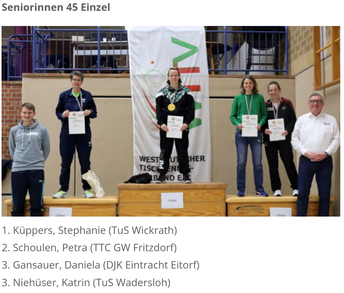 einen guten 3. Platz. Petra Schoulen belegte bei den Seniorinnen 45 im Einzel u. im Doppel jeweils den 2. Platz